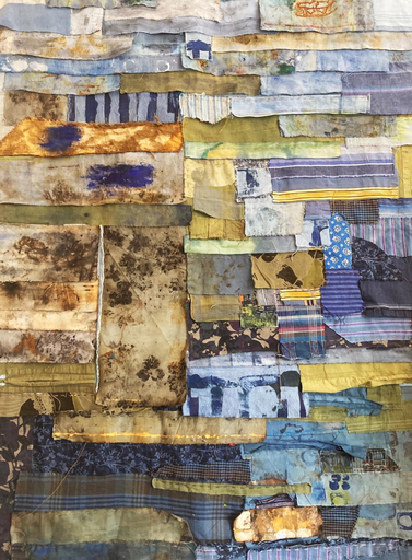 Het materiaal is licht en flexibel; goed te bewerken met verschillende technieken. En wat voor mij belangrijk is: het laat zich makkelijk vouwen en plooien tot een handzaam formaat. Ik stop het in mijn tas en reis als een nomade verder, naar een volgende bestemming. En zo is het ook met mijn werk: het beweegt zich van het een naar het ander. Soms krijgt een doek weer een nieuw leven door het te verven, erin te naaien, er een tekst in te schrijven; achterkant wordt voorkant. Daarmee vangt het zowel schaduw als licht.